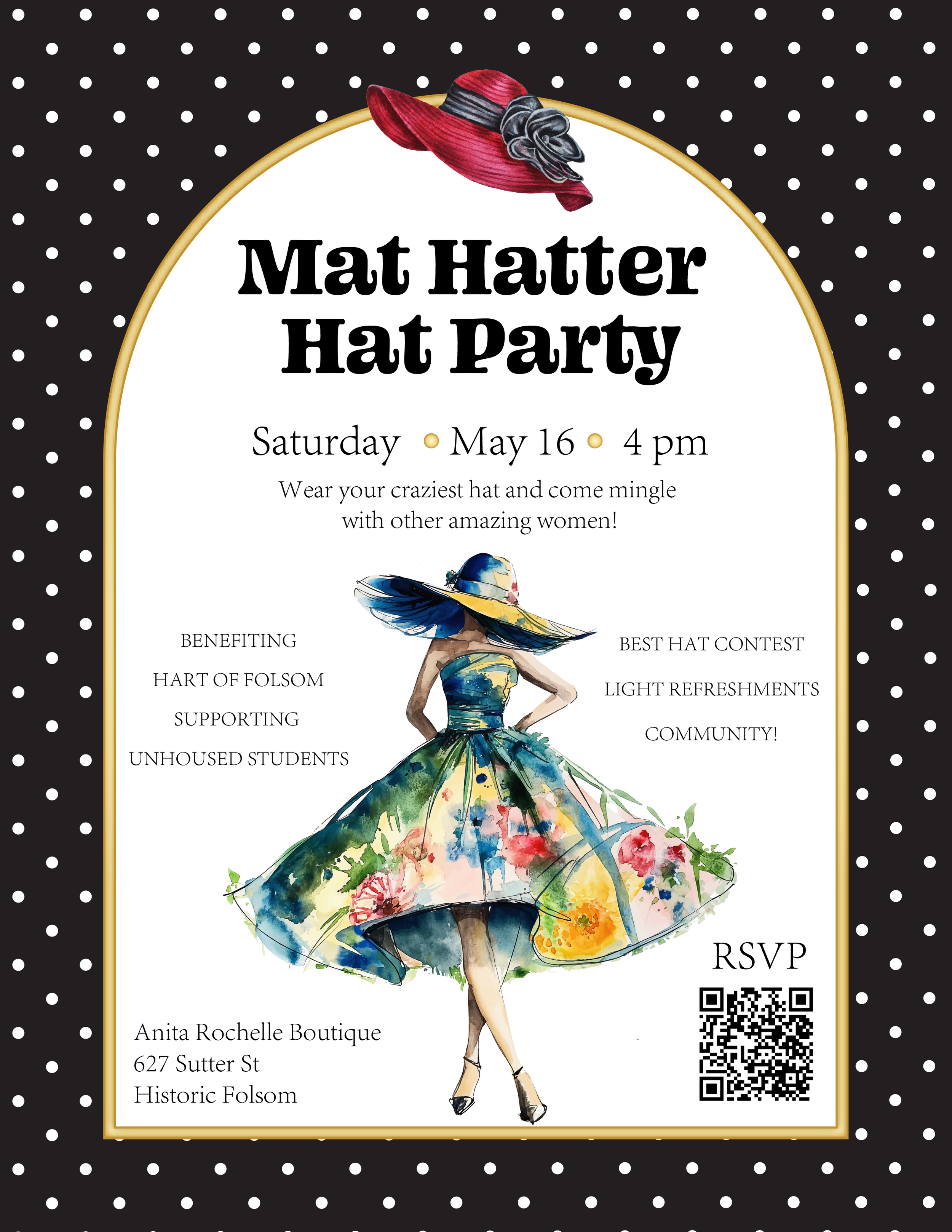 Join us and the amazing women of our community for a Mat Hatter Hat Party at Anita Rochelle Boutique on Saturday, May 16 @ 4pm.